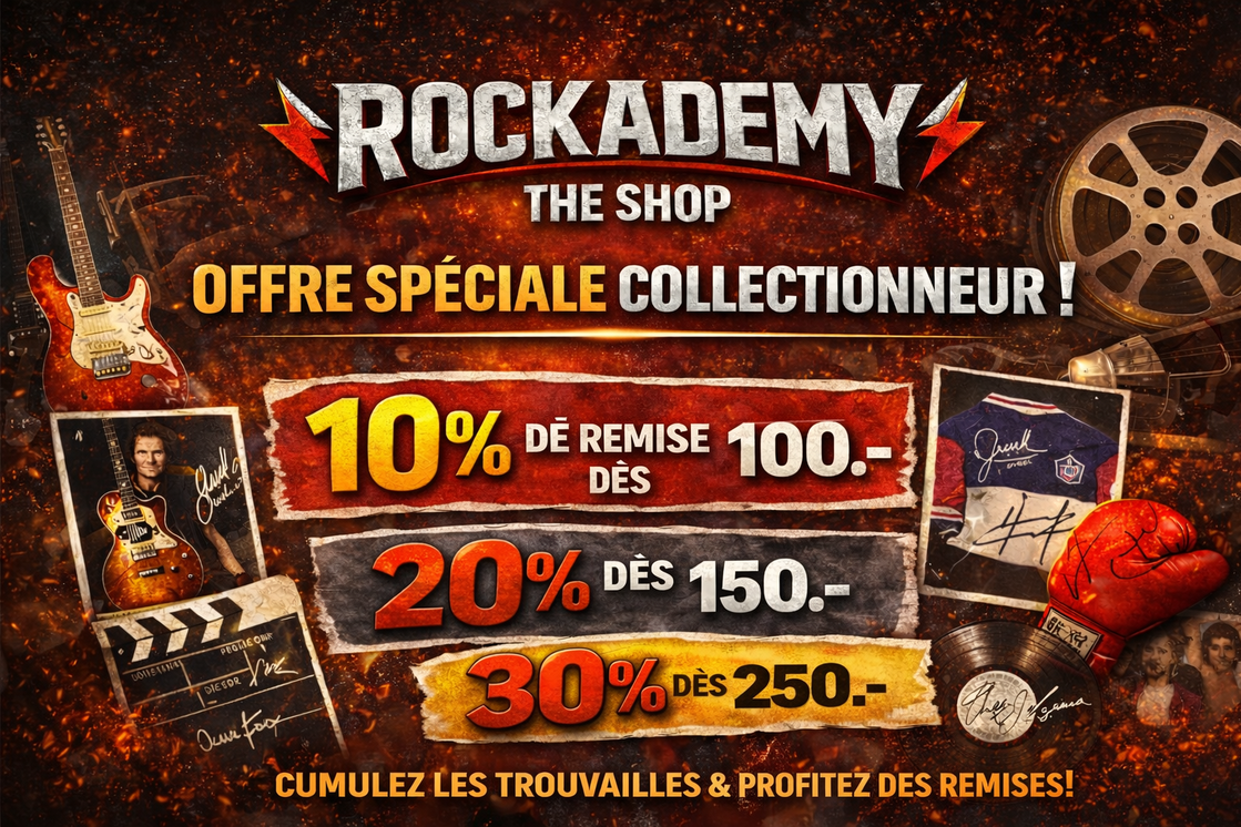 "Plongez dans un univers unique avec plus de 1000 objets collectors, rares, signés ou numérotés. Offrez-vous un véritable trésor de la collection Rockademy et ajoutez une pièce d'exception à votre propre collection."